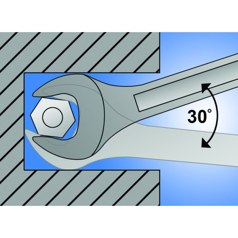 The wrench is forged from premium chromium-vanadium steel. The wrench is distinguished by its exceptional toughness, durability and surface protection, which offers the user reliable and long-lasting use. It is an all-round solution for screwing bolts and nuts and an indispensable tool for professionals and DIY enthusiasts alike. • material: premium chrome vanadium steel • drop forged, entirely hardened and tempered • surface finish: chrome plated according to ISO 1456:2009 • polished head • made according to standard ISO 10102 (only metric dimension) • head of the wrench under 15°