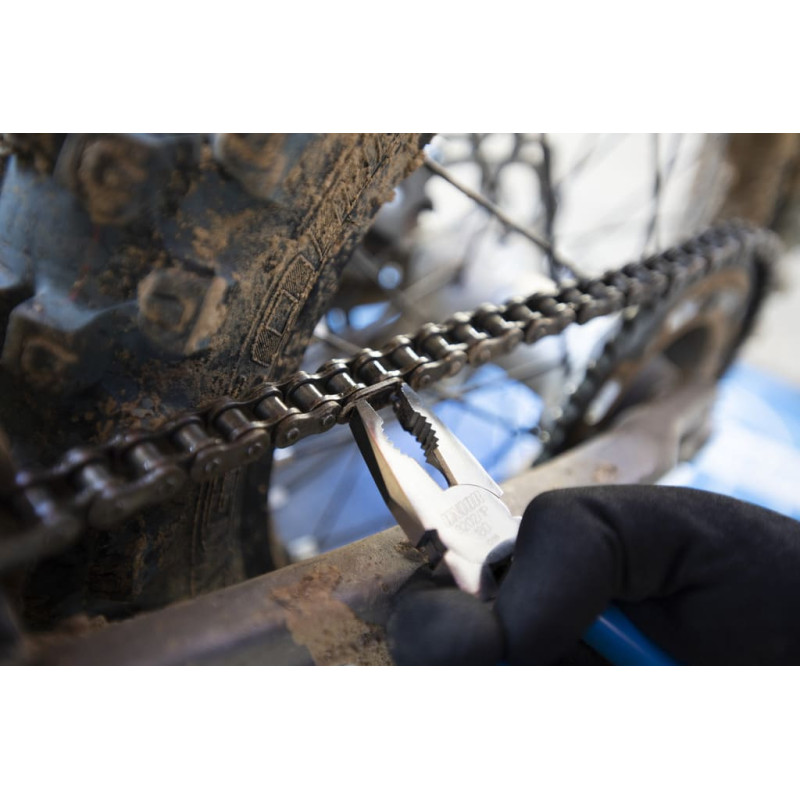 The pliers enable assembly and disassembly of the connecting link clip on the motorcycle’s chain. • material: premium plus carbon steel • drop forged, entirely hardened and tempered • cutting edges induction hardened • head polished • surface finish: chrome plated to standard ISO 1456:2009 • handles plastic dipped • • Advantages: • Specially designed groove enables easy positioning and prevents the pliers from slipping off the chain’s pin. • The jaw is shortened for easier assembly or disassembly of the clip.