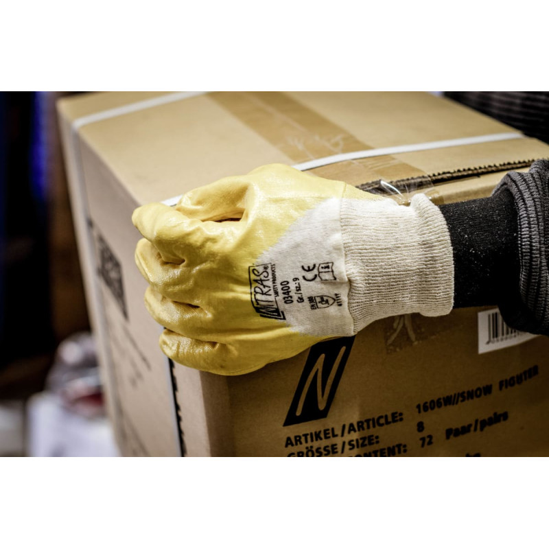 NITRAS nitrile gloves, cotton interlock, natural colour, nitrile coating, yellow (colour code: 1643), 3/4-coated, knitted wrist