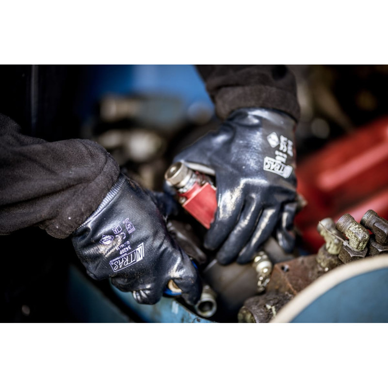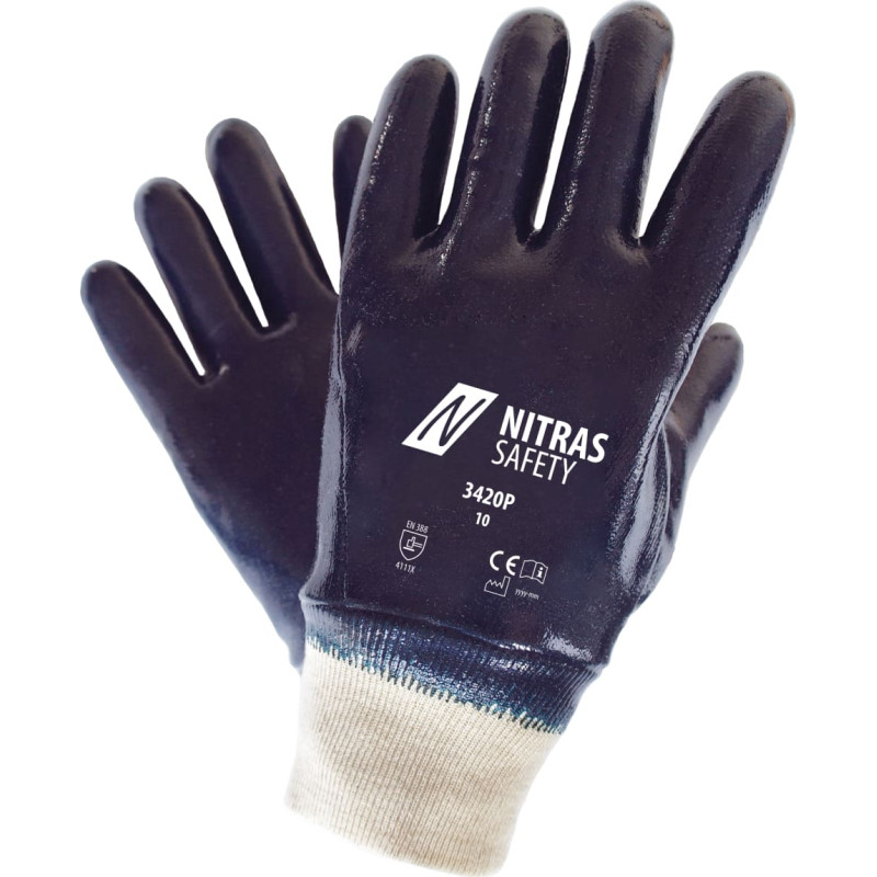 NITRAS nitrile gloves, cotton jersey, white, bleached, nitrile coating, blue (colour code: 2200), fully coated, knitted wrist, very soft, perfect wearing comfort,, premium-quality