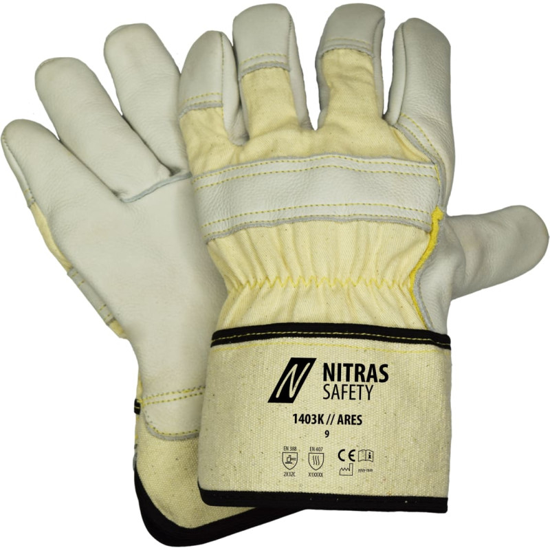 NITRAS ARES, cut protection gloves, cotton back, natural colour, cow grain leather, grey (colour code: 1612), palm lined with special yarn KATA 5, thumb and index finger fully lined, canvas cuff, double-stitched Kevlar seams, leather selection A, high cut resistance, protection against contact heat (100° C, 15 seconds), highest wearing comfort, large style, perfect fit, premium quality