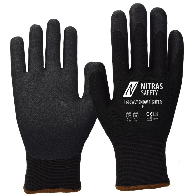 NITRAS SNOW FIGHTER, winter gloves, nylon, black, seamless knitted terry cloth inside, nitrile coating, black (colour code: 1000), sanded, partly coated on palm and fingertips, knitted wrist, highest wearing comfort, highest dexterity, touchscreen compatible