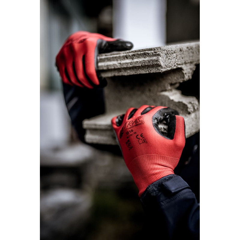 NITRAS nylon gloves, red, nitrile foam coating, black (colour code: 6010), partly coated on palm and fingertips, knitted wrist