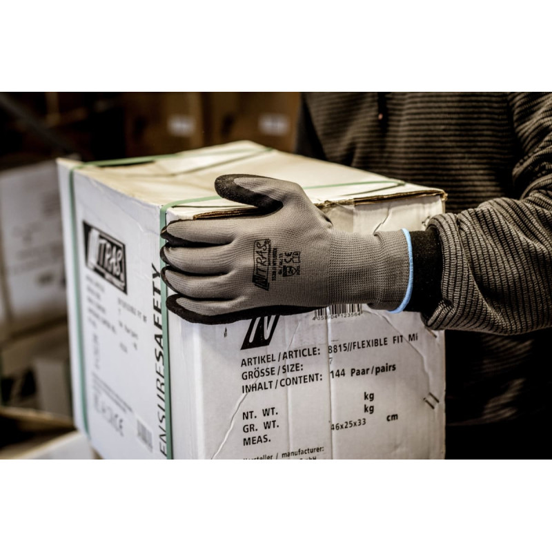 NITRAS NYLOTEX, nylon gloves, grey, latex coating, black (colour code: 1210), crinkled finish ultimate grip, partly coated on palm and fingertips, knitted wrist