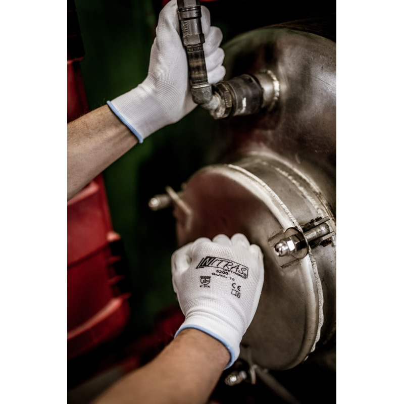 NITRAS nylon gloves, white, PU coating, white (colour code: 1100), partly coated on palm and fingertips, knitted wrist