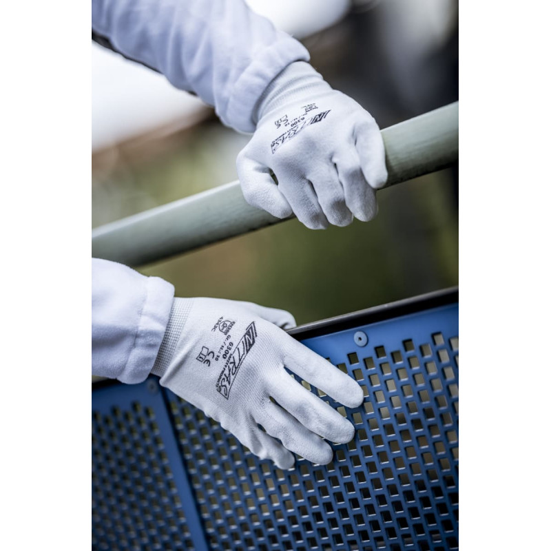 NITRAS cut protection gloves, special yarn, white, PU coating, white (colour code: 1100), partly coated on palm and fingertips, knitted wrist, high cut resistance, highest wearing comfort