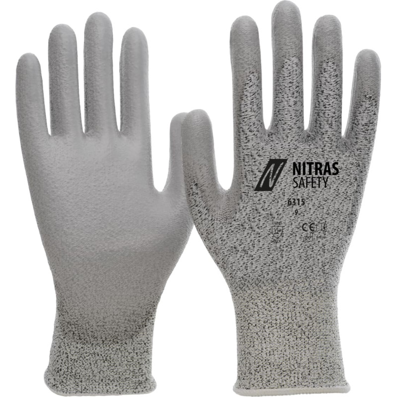 NITRAS cut protection gloves, special yarn, grey, PU coating, grey (colour code: 1200), partly coated on palm and fingertips, knitted wrist, high cut resistance, highest wearing comfort