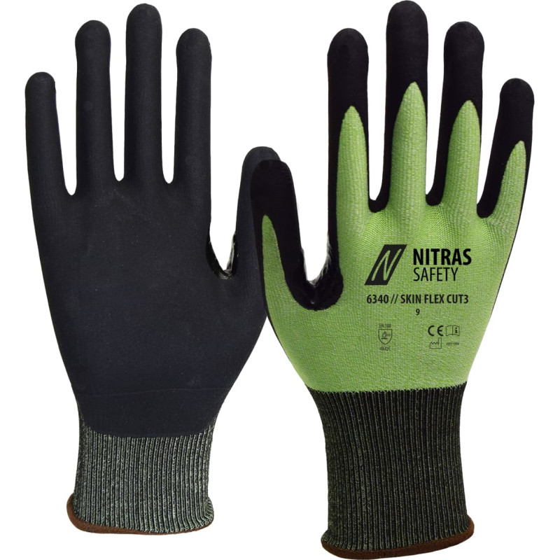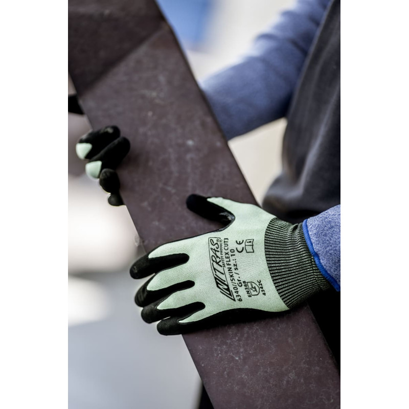 NITRAS SKIN FLEX CUT3, cut protection gloves, Special yarn, green, special coating, black (colour code: 3010), partly coated on palm and fingertips, knitted wrist, knitted wrist, high cut resistance, highest wearing comfort, 18 Gauge, perfect fit, reinforced thumb crotch, touchscreen compatible