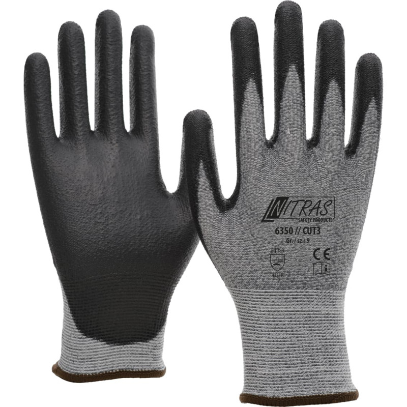 NITRAS CUT3, cut protection gloves, special yarn, grey, PU coating, black (colour code: 1210), partly coated on palm and fingertips, knitted wrist, high cut resistance, highest wearing comfort