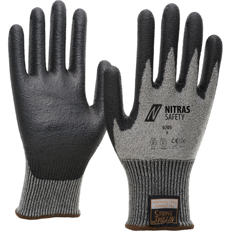 NITRAS TAEKI cut protection gloves, TAEKI special yarn, grey, PU coating, black (colour code: 1210), partly coated on palm and fingertips, knitted wrist, high cut resistance, protection against contact heat (100° C, 15 seconds), highest wearing comfort, highest dexterity