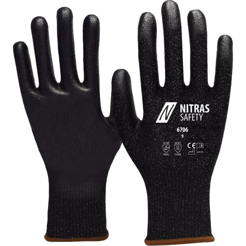NITRAS cut protection gloves, special yarn, black, PU coating, black (colour code: 1000), partly coated on palm and fingertips, knitted wrist, high cut resistance, protection against contact heat (100° C, 15 seconds), highest wearing comfort, highest dexterity