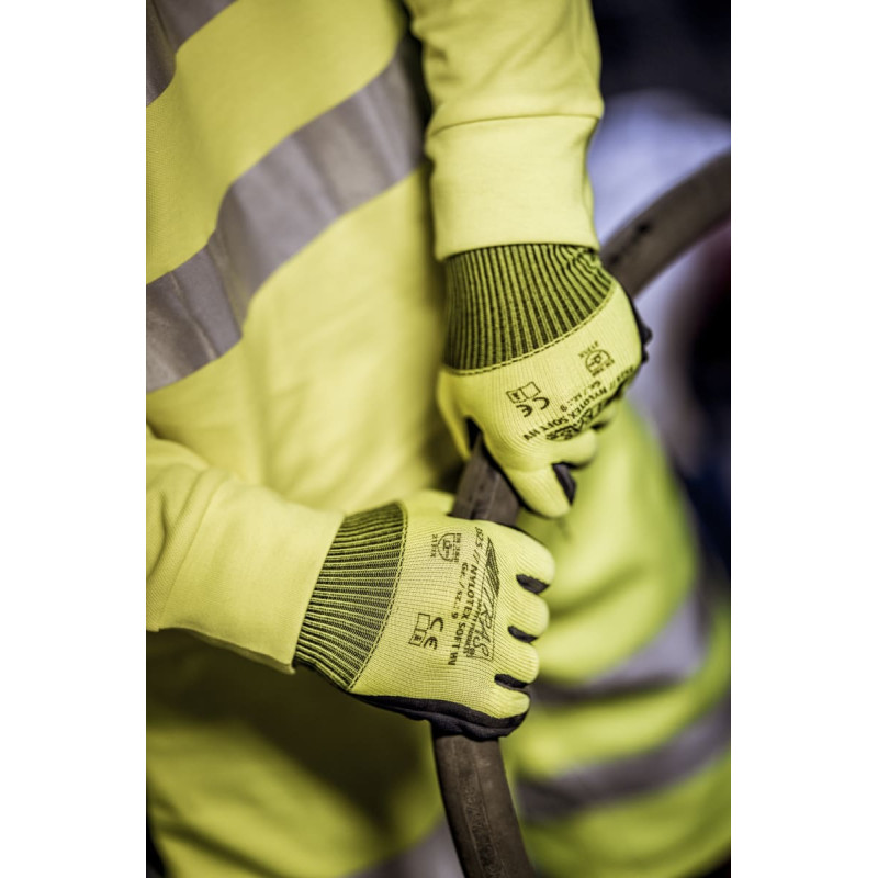 NITRAS NYLOTEX SOFT HV, assembly gloves, neon yellow, latex foam coating, dark blue (colour code: 4024), partly coated on palm and fingertips, knitted wrist, very soft and cuddly, very slip resistant, perfect grip, very good tactile sensitivity, very good dry and wet grip, PPE risk category II