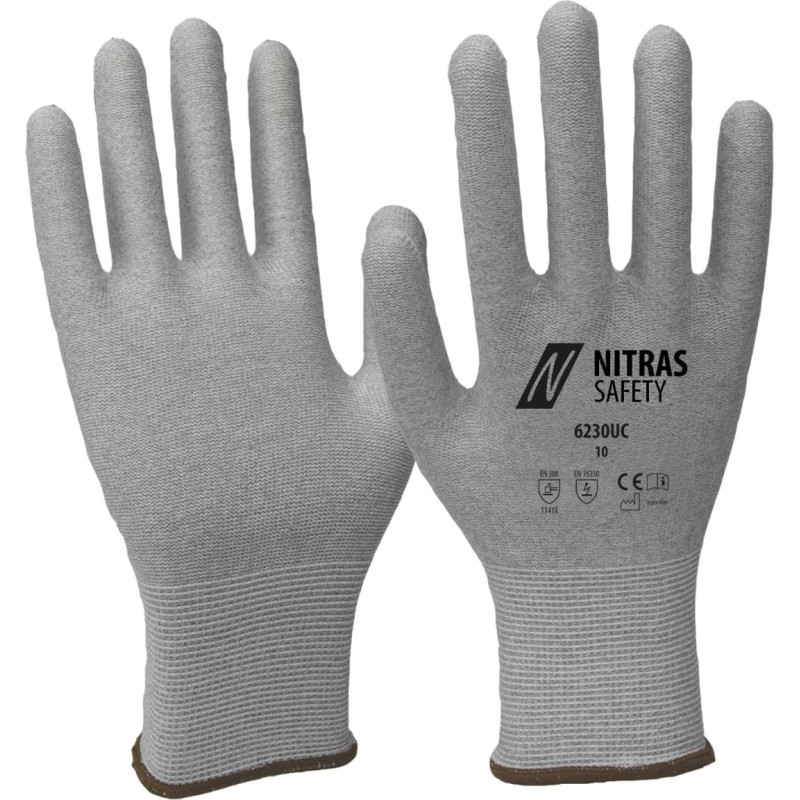 NITRAS antistatic gloves, nylon carbon fabric, grey (colour code: 1200), integrated carbon fibre, uncoated, knitted wrist, antistatic (dissipative), touchscreen capable, particularly sensitive, perfect for working with small parts, very good tactile sensitivity, PPE risk category II