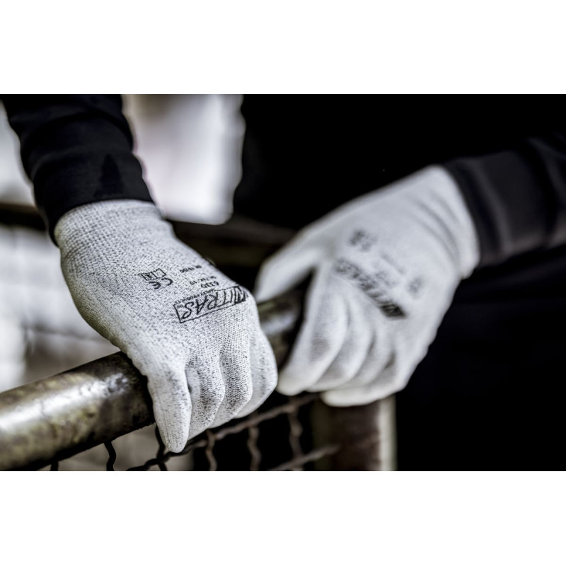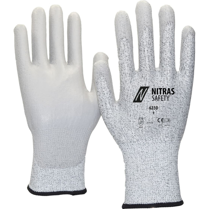 NITRAS antistatic gloves, special yarn, grey, integrated carbon fibre, PU coating, grey (colour code: 1200), partly coated on palm and fingertips, knitted wrist, high cut resistance, highest wearing comfort, antistatic (dissipative), touchscreen capable, particularly sensitive, perfect for working with small parts, very good tactile sensitivity, PPE risk category II