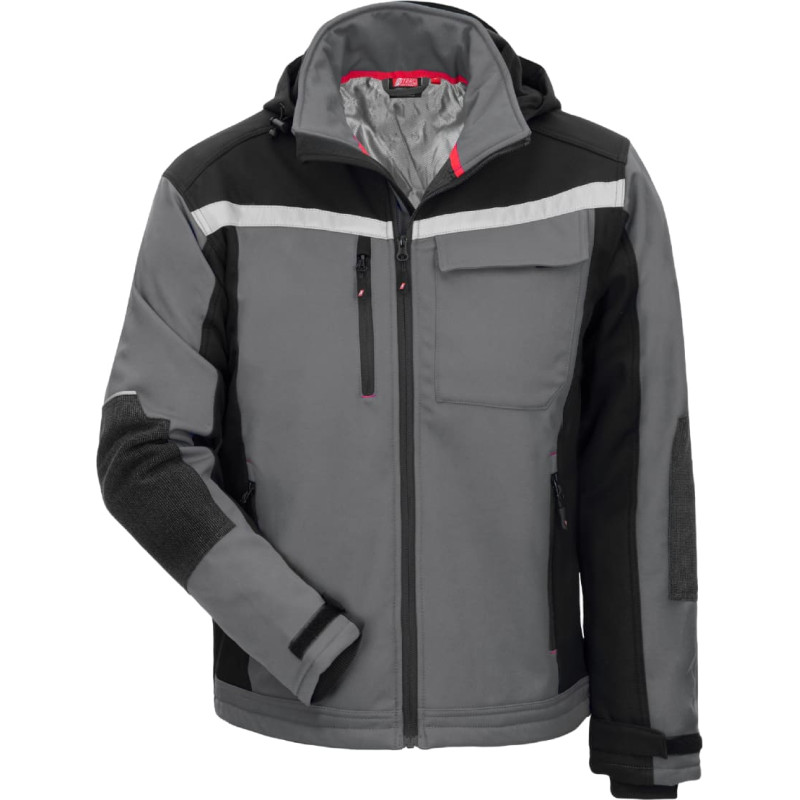 NITRAS MOTION TEX PLUS, softshell jacket, grey / black (colour code: 1210), 340 g/sqm, high wearing comfort thanks to soft softshell material with water-repellent and wind resistant properties and extended back, adjustable cuffs with hook and loop fastener and drawstring waist for optimal fit, heat insulating lining,reinforced elbows for high resistance, reflective elements for better visibility, stand-up collar, continuous YKK-zipper with chin protection and wind stopper inside, inside, chest and side pockets, wristlet for cold temperatures, removable hood with drawstring for fixation, shell fabric: hydrostatic head: 8,000 mmH2O / breathability: 3,500 sqm/24h, Comfort Fit