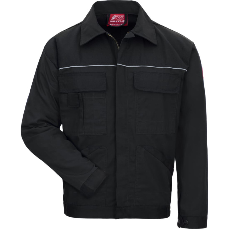 NITRAS MOTION TEX LIGHT, work jacket, black (colour code: 1000), 245 g/sqm, breathable and light-weight material, high wearing comfort, adjustable cuffs with buttons, elastic waist, collar, reinforcements on shoulders, pockets and waist, continuous front zipper with additional push button at the bottom and wind stopper outside, reflective elements for better visibility, practical and functional details: two chest pockets with flaps and additional smartphone pocket, two pen pockets and side pockets, inside pocket, OEKO-TEX STANDARD 100®, Regular Fit