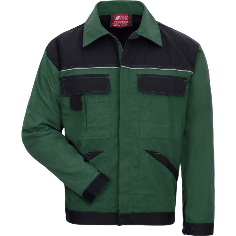 NITRAS MOTION TEX LIGHT, work jacket, green / black (colour code: 3010), 245 g/sqm, breathable and light-weight material, high wearing comfort, adjustable cuffs with buttons, elastic waist, collar, reinforcements on shoulders, pockets and waist, continuous front zipper with additional push button at the bottom and wind stopper outside, reflective elements for better visibility, practical and functional details: two chest pockets with flaps and additional smartphone pocket, two pen pockets and side pockets, inside pocket, OEKO-TEX STANDARD 100®, Regular Fit