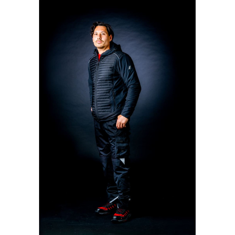 NITRAS MOTION TEX PLUS, quilted softshell jacket, black (colour code: 1000), 340 g/sqm, pleasant wearing comfort thanks to extended back, elastics at cuffs and drawstring waist for optimal fit, sporty design, quilted front and back side, very warming, reflective piping on shoulder and back for better visibility, stand-up collar, continuous YKK-zipper with double-layered wind stopper inside, chest pocket, side pockets, hood with drawstring for fixation