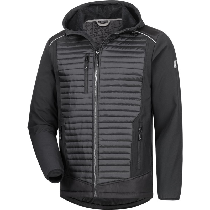 NITRAS MOTION TEX PLUS, quilted softshell jacket, black (colour code: 1000), 340 g/sqm, pleasant wearing comfort thanks to extended back, elastics at cuffs and drawstring waist for optimal fit, sporty design, quilted front and back side, very warming, reflective piping on shoulder and back for better visibility, stand-up collar, continuous YKK-zipper with double-layered wind stopper inside, chest pocket, side pockets, hood with drawstring for fixation