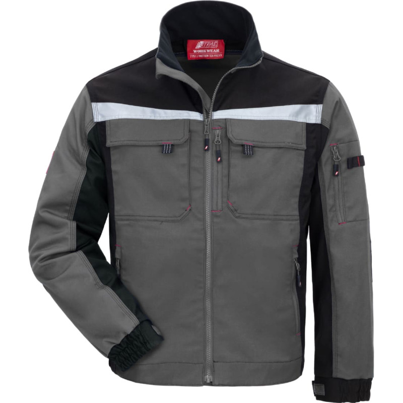 NITRAS MOTION TEX PRO FX, work jacket, grey / black (colour code: 1210), 280 g/sqm, breathable material, very high wearing comfort (2-way stretch), adjustable cuffs with hook and loop fastener, extended back, pleasantly soft fleece stand-up collar, reinforcements on pockets and sleeves as well as shoulders and reinforcements made of CORDURA® on elbows and back, durable triple-stitched seams, continuous front YKK-zipper with chin protection and wind stopper inside, 3M Scotchlite™ Reflective Material for better visibility, versatile and practical equipped: two chest pockets with flaps, side pockets, tablet, inside and Napoleon pocket, sleeve pocket with pen loops, premium quality, OEKO-TEX STANDARD 100®, Comfort Fit