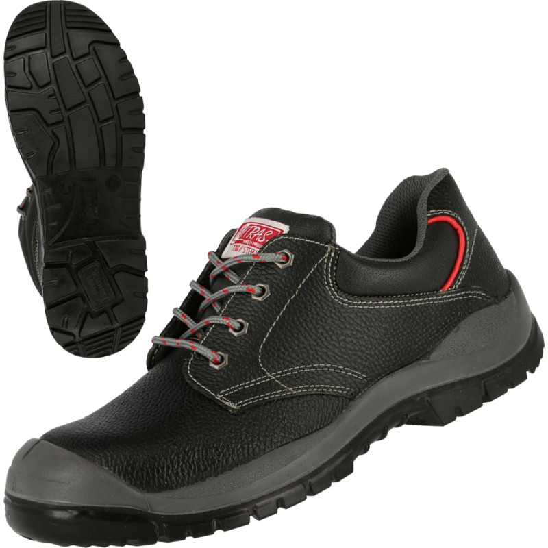 NITRAS STEP, S3 safety shoes, durable grain leather, black, tough PU / TPU outsole, grey / black, steel toe cap, steel perforation resistant midsole, ergonomic insocks, appealing design, flattened heel for a natural rolling movement of the foot, width 11, additional toe cap