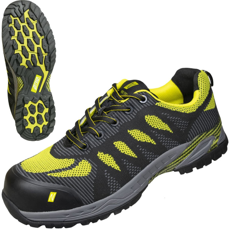 NITRAS PRO STEP, safety shoes, S1P, durable textile, black / lime (colour code: 1042), seamless upper, tough nitrile / EVA outsole, black / grey, fibreglass toe cap, textile perforation resistant midsole, metal-free, premium insock 700C // COMFORT STEP, ergonomically formed, sporty design, highest slip resistance (SRC), width 11, heel lining for easy donning and doffing and heel reinforcement made of robust microfibre, DGUV Rule 112-191-certified, ESD-capable