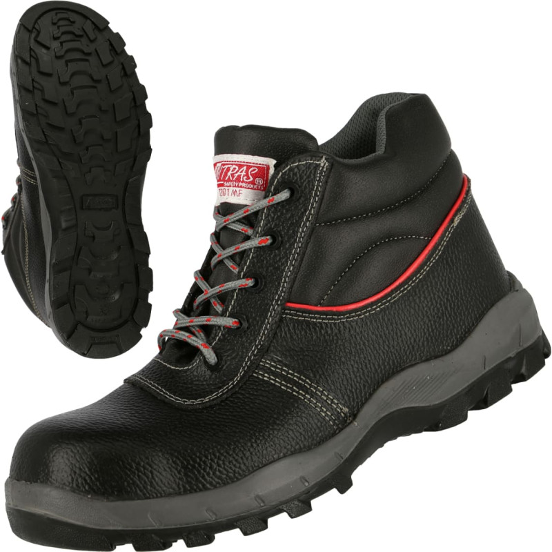 NITRAS STEP MID MF, S3 safety boots, half-height, durable grain leather, black (colour code: 1000), tough PU / TPU outsole, grey / black, steel toe cap, steel perforation resistant midsole, ergonomic insocks, appealing design, flattened heel for a natural rolling movement of the foot, width 11, additional toe cap, well padded bootleg for optimal fit and comfort