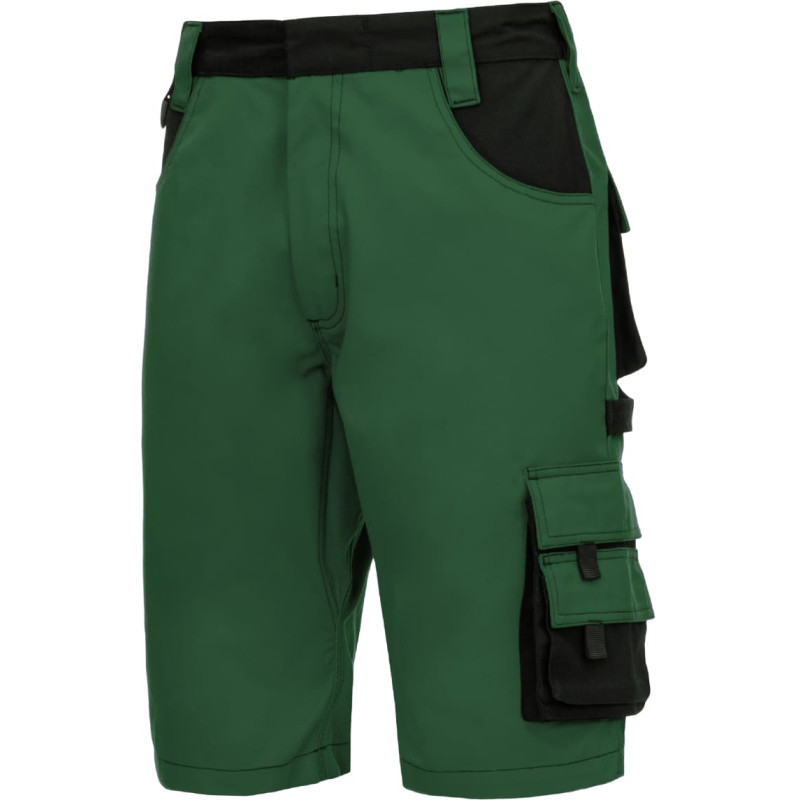 NITRAS MOTION TEX PLUS, short work trousers, green / black (colour code: 3010), 280 g/sqm, breathable material, high wearing comfort, elastic waist with raised back, reinforcement on back belt loop and reinforcements made of Canvas on back and leg pockets, durable triple-stitched seams, covered button for product protection (e.g. scratches), reflective elements for better visibility, practical and useful extras: thigh pockets with flaps, ruler pocket with additional pocket, hammer loop, D-ring, OEKO-TEX STANDARD 100®, Comfort Fit