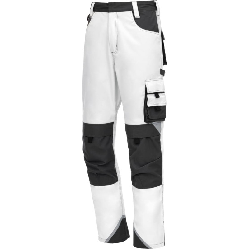 NITRAS MOTION TEX PLUS, long work trousers, white / grey (colour code: 1112), 280 g/sqm, breathable material, high wearing comfort, elastic waist with raised back, reinforcement on back belt loop and reinforcements made of Canvas on back, knee, leg pockets and ankles, durable triple-stitched seams, covered button for product protection (e.g. scratches), reflective elements for better visibility, practical and useful extras: thigh pockets with flaps, ruler pocket with additional pocket, knee pockets for protectors with insertion from above, hammer loop, D-ring, OEKO-TEX STANDARD 100®, Comfort Fit, knee protectors 76K (EN 14404) optionally available
