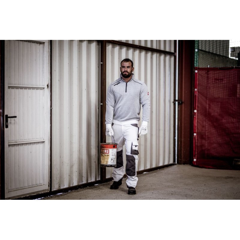 NITRAS MOTION TEX PLUS, long work trousers, white / grey (colour code: 1112), 280 g/sqm, breathable material, high wearing comfort, elastic waist with raised back, reinforcement on back belt loop and reinforcements made of Canvas on back, knee, leg pockets and ankles, durable triple-stitched seams, covered button for product protection (e.g. scratches), reflective elements for better visibility, practical and useful extras: thigh pockets with flaps, ruler pocket with additional pocket, knee pockets for protectors with insertion from above, hammer loop, D-ring, OEKO-TEX STANDARD 100®, Comfort Fit, knee protectors 76K (EN 14404) optionally available