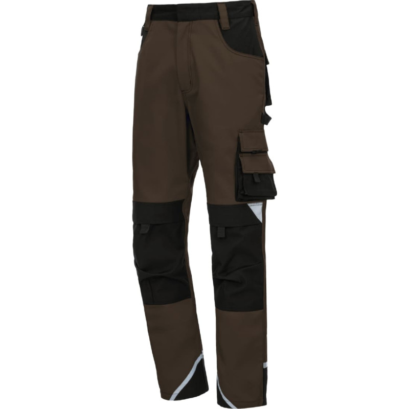 NITRAS MOTION TEX PLUS, long work trousers, brown / black (colour code: 5010), 280 g/sqm, breathable material, high wearing comfort, elastic waist with raised back, reinforcement on back belt loop and reinforcements made of Canvas on back, knee, leg pockets and ankles, durable triple-stitched seams, covered button for product protection (e.g. scratches), reflective elements for better visibility, practical and useful extras: thigh pockets with flaps, ruler pocket with additional pocket, knee pockets for protectors with insertion from above, hammer loop, D-ring, OEKO-TEX STANDARD 100®, Comfort Fit, knee protectors 76K (EN 14404) optionally available