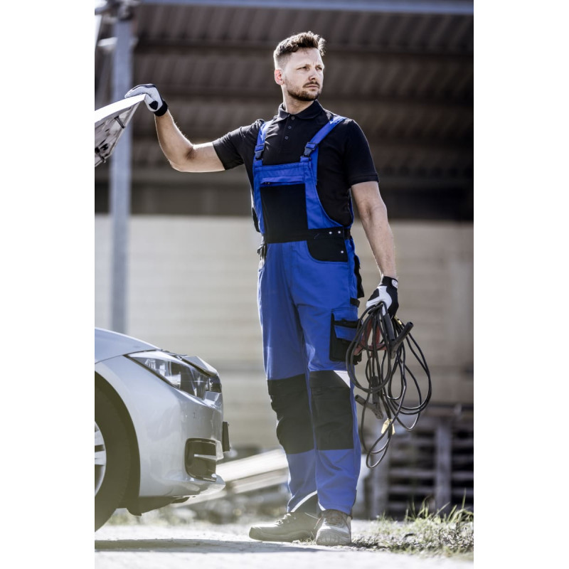 NITRAS MOTION TEX PLUS, bib pants, royal blue / black (colour code: 2010), 280 g/sqm, breathable material, high wearing comfort, elastic waist, reinforcements made of canvas on leg, knee, back pockets as well as outside bib pocket and ankles, durable triple-stitched seams, reflective elements for better visibility, practical and useful extras: thigh pockets with flaps, ruler pocket with additional pocket, bib inside pocket with YKK-zipper and additional outside pockets, knee pockets for protectors with insertion from above, hammer loop, D-ring, durable clips, elastic straps, OEKO-TEX STANDARD 100®, Comfort Fit, knee protectors 76K (EN 14404) optionally available