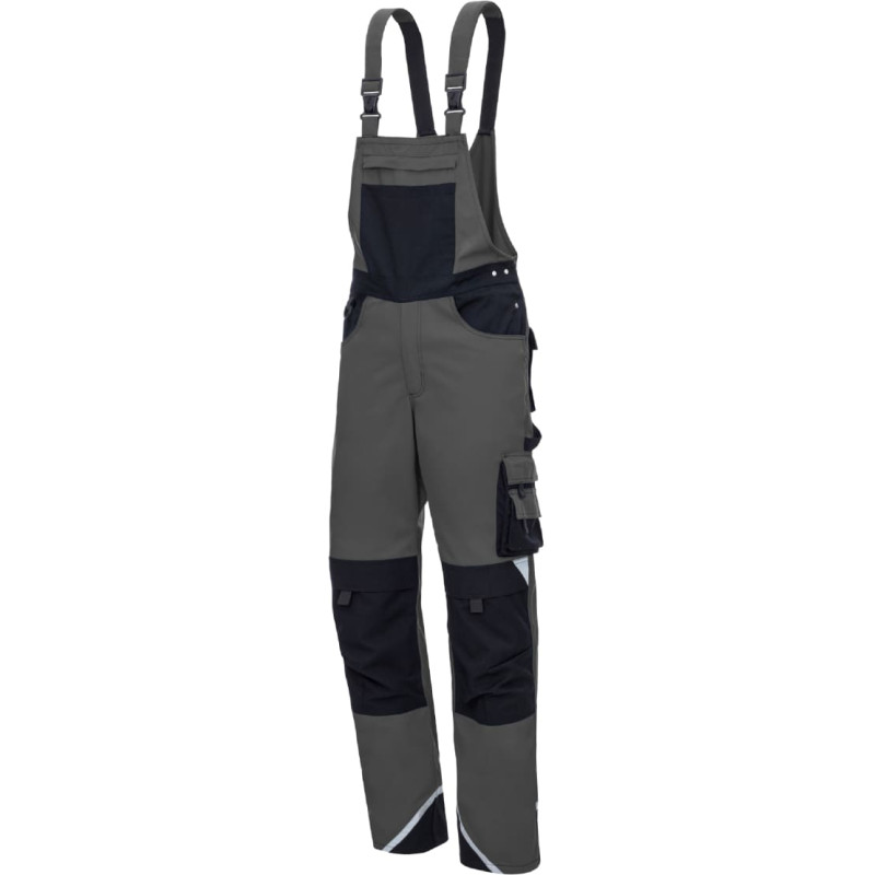NITRAS MOTION TEX PLUS, bib pants, grey / black (colour code: 1210), 280 g/sqm, breathable material, high wearing comfort, elastic waist, reinforcements made of canvas on leg, knee, back pockets as well as outside bib pocket and ankles, durable triple-stitched seams, reflective elements for better visibility, practical and useful extras: thigh pockets with flaps, ruler pocket with additional pocket, bib inside pocket with YKK-zipper and additional outside pockets, knee pockets for protectors with insertion from above, hammer loop, D-ring, durable clips, elastic straps, OEKO-TEX STANDARD 100®, Comfort Fit, knee protectors 76K (EN 14404) optionally available
