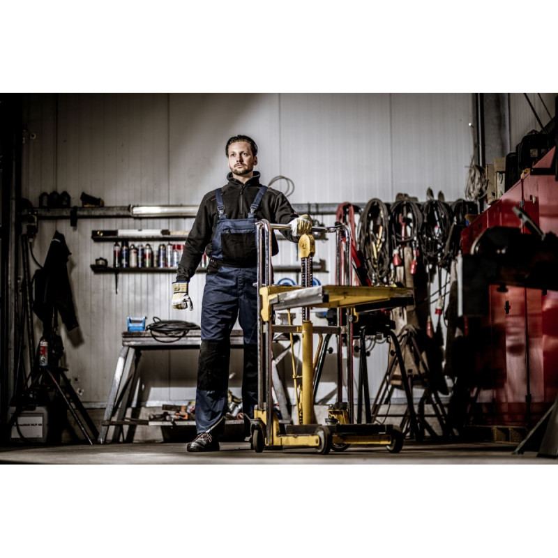 NITRAS MOTION TEX PLUS, bib pants, navy blue / black (colour code: 2110), 280 g/sqm, breathable material, high wearing comfort, elastic waist, reinforcements made of canvas on leg, knee, back pockets as well as outside bib pocket and ankles, durable triple-stitched seams, reflective elements for better visibility, practical and useful extras: thigh pockets with flaps, ruler pocket with additional pocket, bib inside pocket with YKK-zipper and additional outside pockets, knee pockets for protectors with insertion from above, hammer loop, D-ring, durable clips, elastic straps, OEKO-TEX STANDARD 100®, Comfort Fit, knee protectors 76K (EN 14404) optionally available