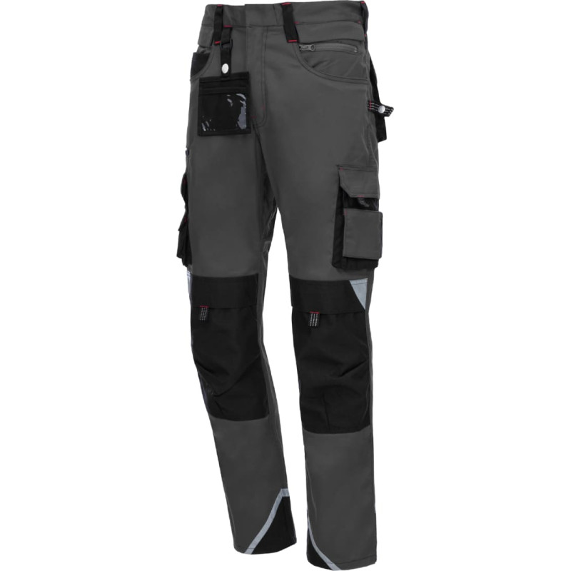 NITRAS MOTION TEX PRO FX, long work trousers, grey / black (colour code: 1210), 280 g/sqm, breathable material, very high wearing comfort (2-way stretch), elastic waist with raised back, reinforcements on back belt loop and crotch and reinforcements made of CORDURA® on back, knee, leg pockets and ankles, durable triple-stitched seams, covered button for product protection (e.g. scratches), 3M Scotchlite™ Reflective Material for better visibility, versatile and practical equipped: thigh pockets with flaps, ruler pocket, knee pockets for protectors with insertion from above, adjustable hammer loop, D-ring, ID pocket, premium quality, OEKO-TEX STANDARD 100®, Comfort Fit, tool pockets 770P and knee protectors 76K (EN 14404) optionally available