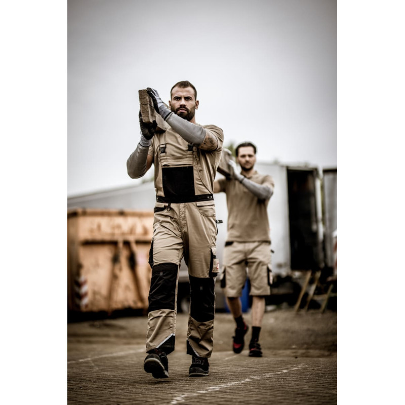 NITRAS MOTION TEX PRO FX, bib pants, khaki / black (colour code: 5110), 280 g/sqm, breathable material, very high wearing comfort (2-way stretch), elastic waist, reinforcements in crotch and reinforcements made of CORDURA® on the leg, knee and back pockets as well as outside bib pocket and ankles, durable triple-stitched seams, 3M Scotchlite™ Reflective Material for better visibility, versatile and practical equipped: thigh pockets with flaps, ruler pocket, bib inside pocket with YKK-zipper and additional outside pockets, knee pockets for protectors with insertion from above, adjustable hammer loop, D-ring, ID pocket, durable clips, elastic straps, premium quality, OEKO-TEX STANDARD 100®, Comfort Fit, tool pockets 770P and knee protectors 76K (EN 14404) optionally available