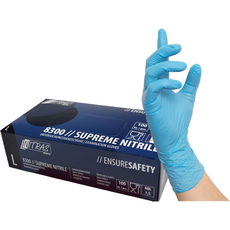 NITRAS SUPREME NITRILE, nitrile disposable gloves, blue (colour code: 2200), non-sterile, rolled edge, powder-free, manufactured according to EN 455, for food contact, ambidextrous (left and right hand), medical gloves, micro-roughened surface, colour code system for sizes, AQL 1,5, protection against micro-organisms, bacteria and viruses, box per 100 pieces