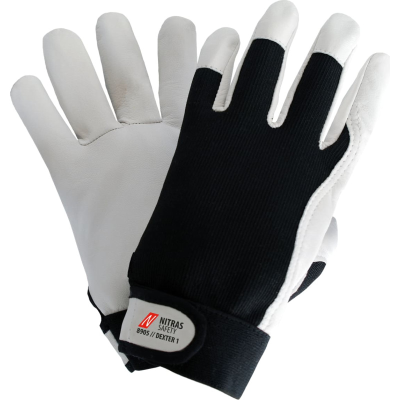 NITRAS DEXTER 1, mechanic gloves, very sleek and durable nappa leather, grey, premium textile back, black (colour code: 1012), unpadded, breathable, perfect sense of touch, excellent fitting due to hook and loop fastener at wrist, premium quality
