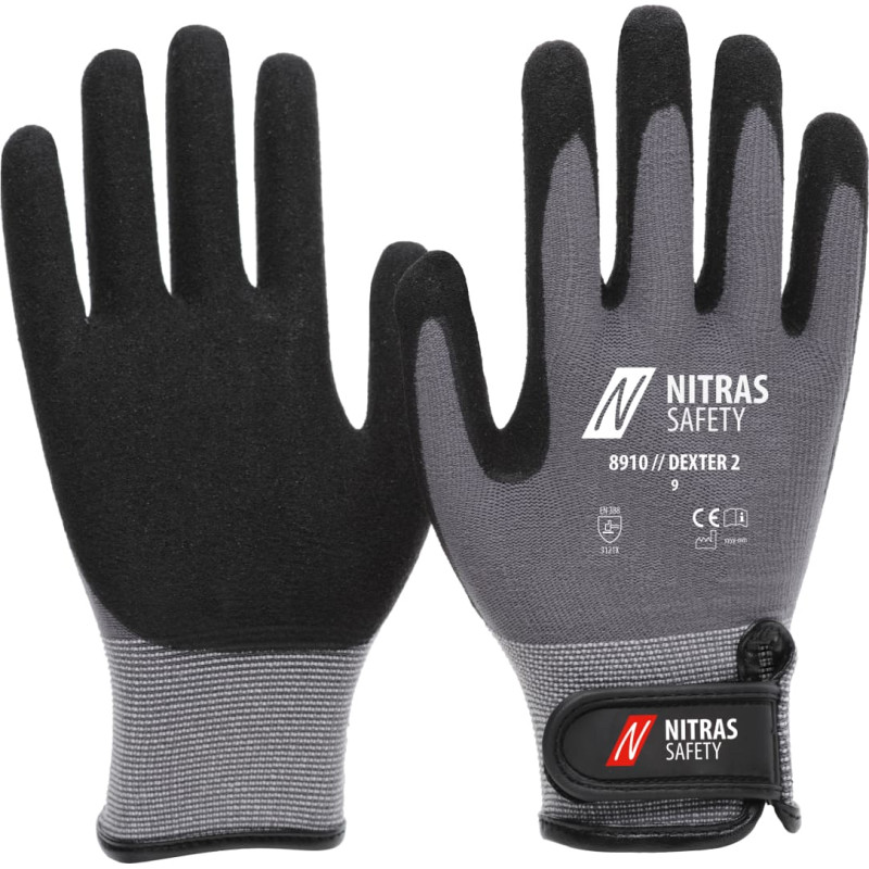 NITRAS DEXTER 2, mechanic gloves, special stretch fabric, grey, latex foam coating, black (colour code: 1210), partly coated on palm and fingertips, knitted wrist, perfect wearing comfort and perfect grip, perfect sense of touch, excellent fitting due to hook and loop fastener at wrist