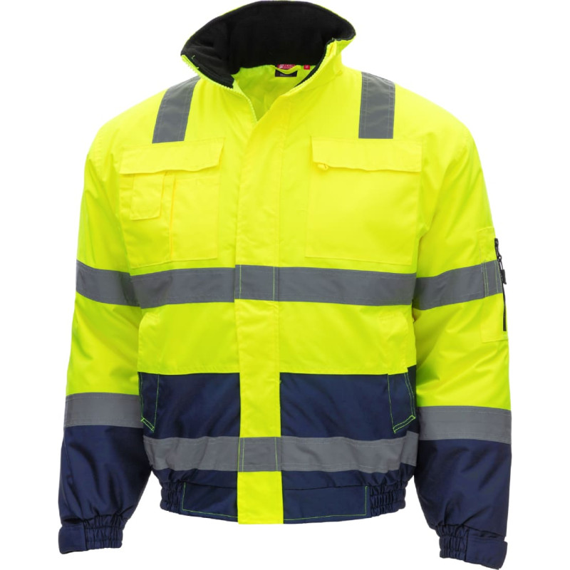 NITRAS MOTION TEX VIZ, high-visibility pilot jacket, neon yellow / navy blue (colour code: 4021), 300 g/sqm, high wearing comfort thanks to soft fleece stand-up collar, adjustable cuffs with hook and loop fastener for fixation, circumferential reflective stripes for very good visibility, continuous zipper with wind stopper outside, two chest and side pockets each (with inside loop for identity card holder), smartphone, sleeve and inside pocket, rollable hood for protection against rain, internal access on the back for finishing, Regular Fit