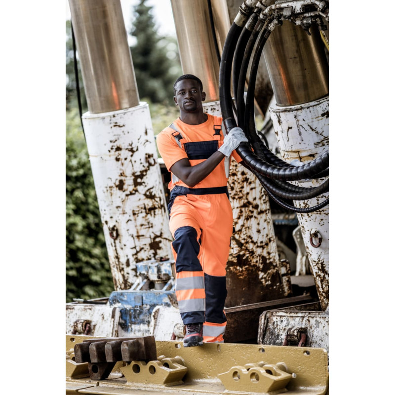 NITRAS MOTION TEX VIZ, high-visibility bib pants, 280 g/sqm, breathable and light-weight material, high wearing comfort, elastic waist, reinforcements on leg, knee, back pockets and outside bib pockets, circumferential reflective stripes and reflective piping at side and knee pockets for very good visibility, practical and funtional details: thigh pocket with flap, ruler pocket with additional pocket, knee pockets for protectors with insertion from below, hammer loop, durable clips, elastic straps, Regular Fit