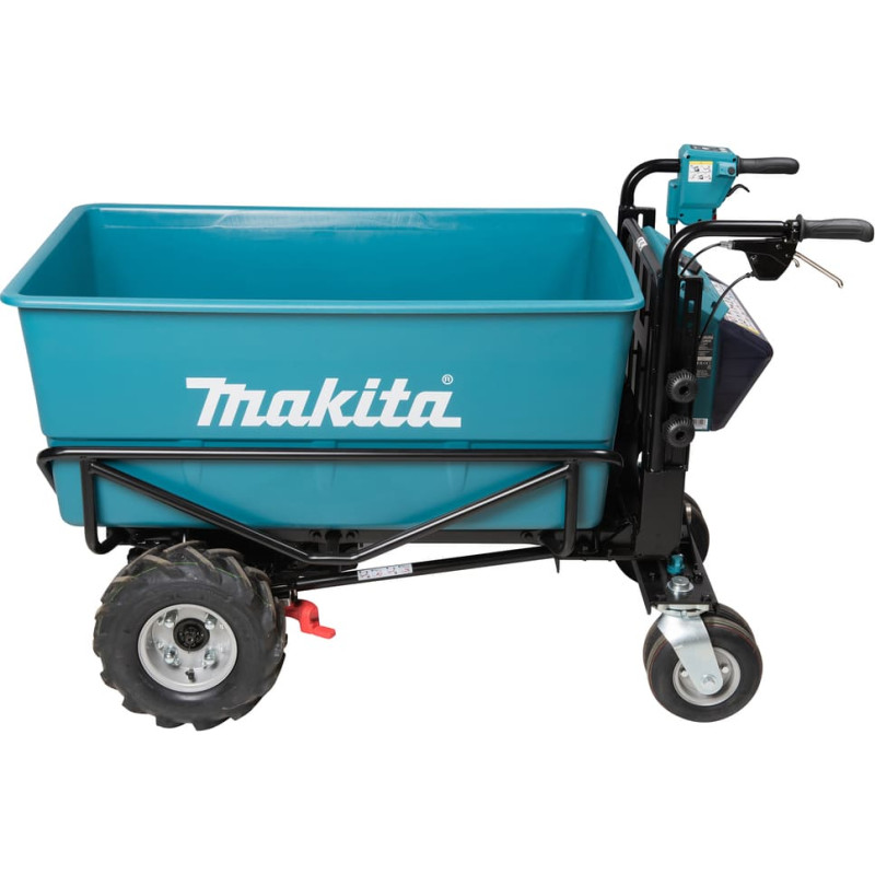 18V X 2 • 180 kg • Ar akumulatoru darbināma ķerra, kas darbojas ar diviem virknē saslēgtiem 18V LXT® akumulatoriem. • 4 riteņu akumulatora ķerra (ar priekšējo riteņu piedziņas sistēmu) stabilai kravas pārvadāšanai, pat ar lielām slodzēm. Manuālās izgāšanas tips, ērtai kravu pārvadāšanai. Sarkans LED aizmugurējais lukturis un divi LED priekšējie lukturi uzmanības pievēršanai un brīdinājumam. Maksimālā pārvadāšanas kapacitāte uz līdzenas virsmas (0 - 3º) ir 300 kg un mainīgā reljefā (3 - 12º) 180 kg.