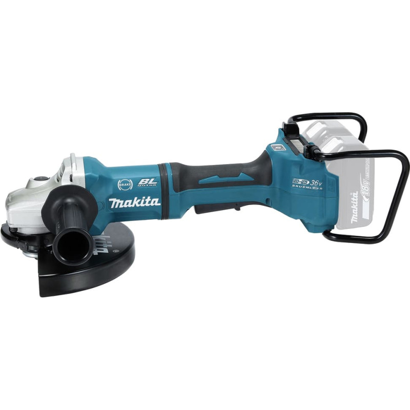 18V X2 • 230mm • 6000min-1 • Efektīvs instruments ar BL motoru, drošu ieslēgšanas slēdzi, AWS un bremzi slīpēšanai un griešanai • Jaudīga, augstas kapacitātes bezsuku leņķa slīpmašīna ar 230 mm disku profesionālam pielietojumam. Augsto 36 V strāvas stiprumu nodrošina divi 18 V LXT® akumulatori. Konstanta ātruma nodrošināšanas elektronika, aizsardzība pret pārslodzi un diska bremze papildu drošībai. Apakšdaļā izvietots drošības slēdzis un automātiskās ieslēgšanas sistēma putekļu likvidēšanai. Tikai instruments, komplektācijā neietilpst akumulators un lādētājs.